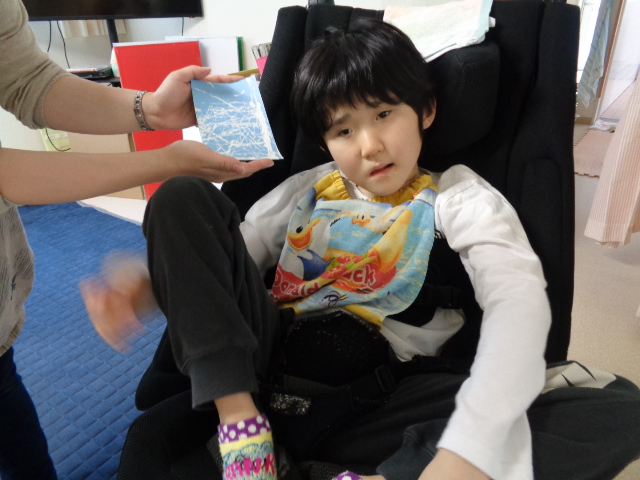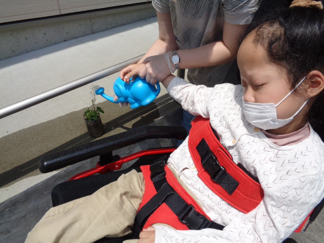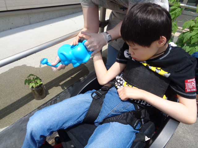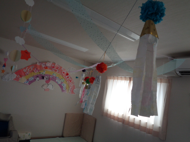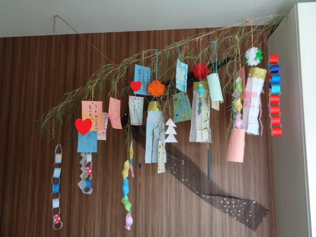 今月は七夕の制作をしました。 短冊は絵の具をつけたビー玉をペットボトルに入れて振ったり… トレーを動かしてビー玉を転がして模様をつけました。 また、色水を使ったにじみ絵で吹き流しも作りました。 皆の願い事が叶いますように… また、5月に種をまいたアサガオが発芽し、水やりのお世話も頑張りました。 大きく育ち、きれいな花が咲きますように