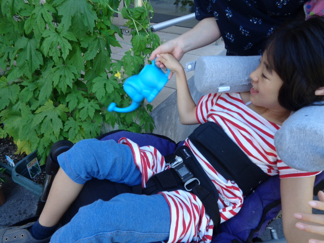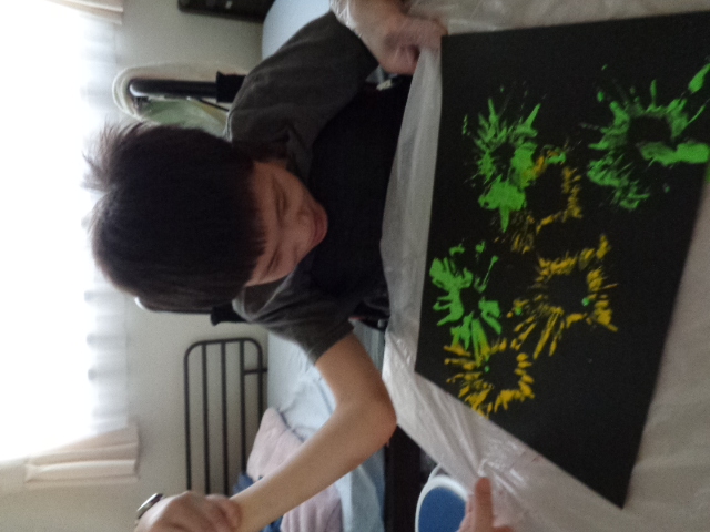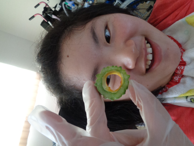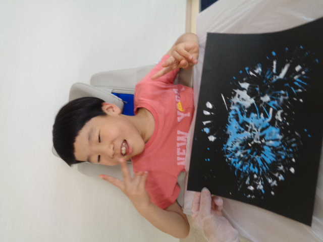 制作では花火を作りました。 絵の具を選んで、黒画用紙の夜空にポンポン 皆が作った大輪の花火がサンキッズの玄関を彩りました。 そして5月に植えたゴーヤは立派なグリーンカーテンになりました 皆で順番に水やり当番を行い、お世話を頑張ったおかげで、緑色5本、白色2本のゴーヤを収穫する事ができました!やった~ 収穫したゴーヤはみんなで触って匂いをかいで…。 「ボコボコしてるね」、白色ゴーヤをみて「トウモロコシ」(みたい)と感想を伝えてくれたり。匂いに嫌そうな表情で気持ちを伝えてくれました。