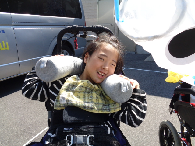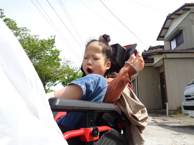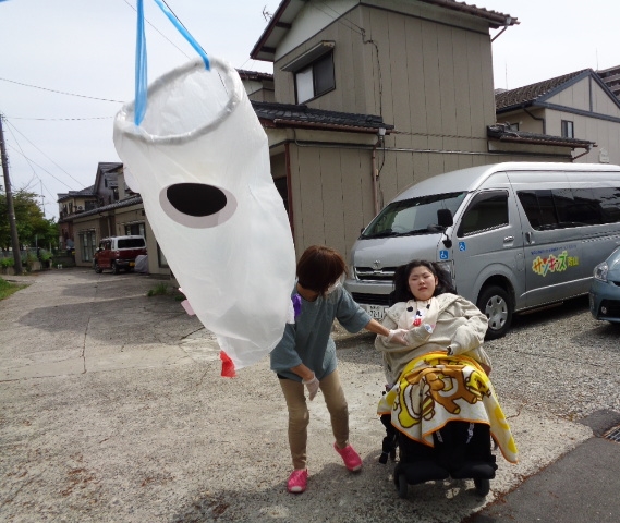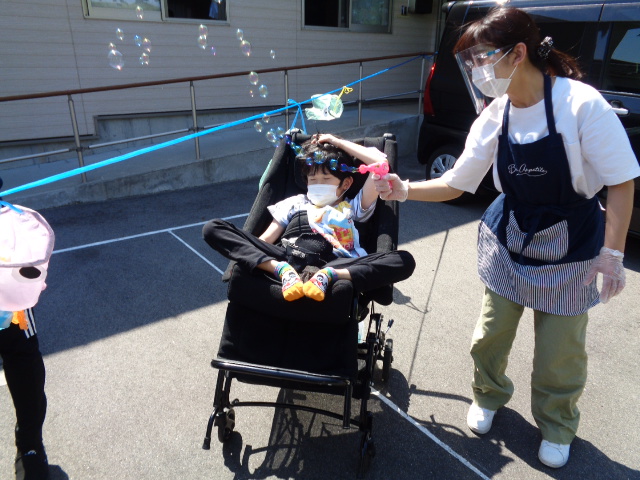 制作活動で作った鯉のぼりと一緒に外気浴をしました。 心地よい風でゆらゆらと泳ぐ鯉のぼりを、じっ…と見つめる方、捕まえようと手を伸ばしたりする方もいました! シャボン玉遊びも行いました。スイッチを握ると出てくるシャボン玉の機械は大人気! 風に乗って遠くへ飛んでいくシャボン玉に、素敵な笑顔がたくさん見られました。