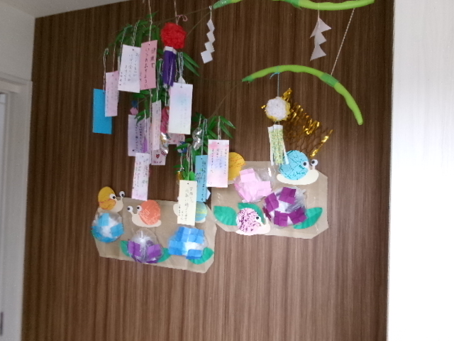完成した、にじみ絵は短冊にしてサンキッズの玄関に飾りました。皆さんの願いごとが叶いますように。