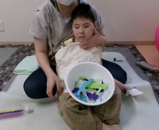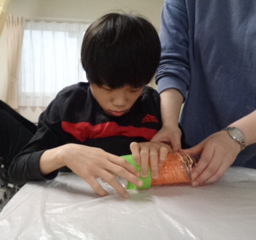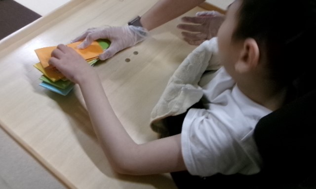 制作では、折り紙を職員と引っ張り合って、細く切っていきました。