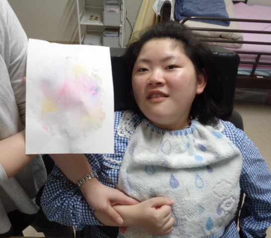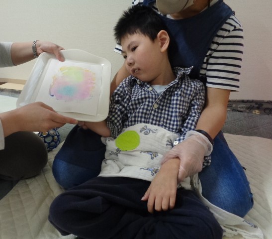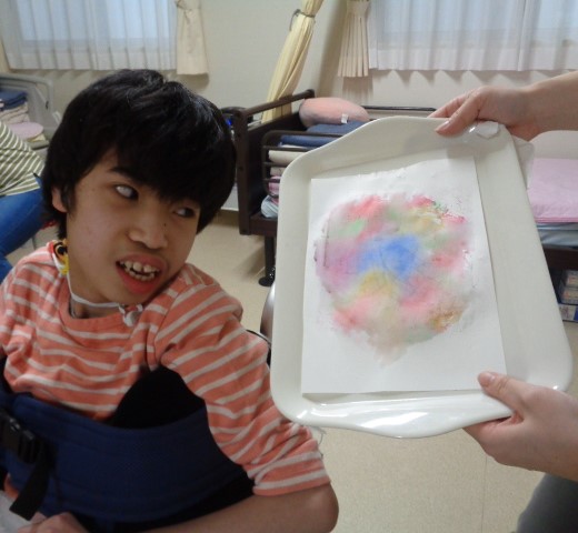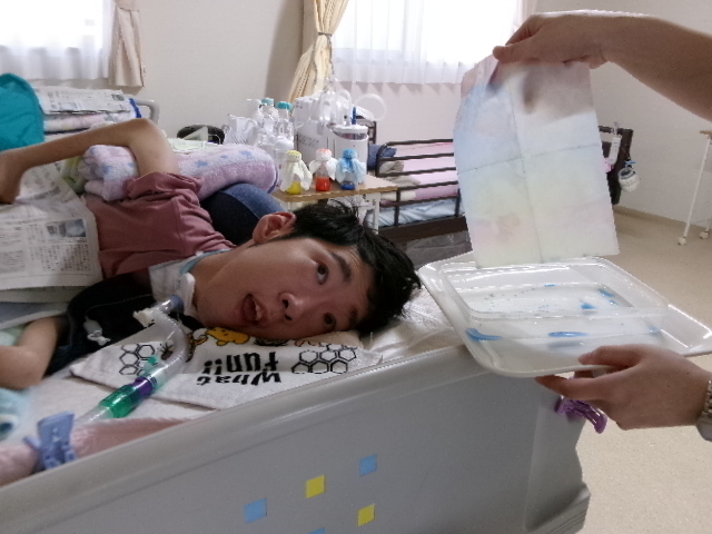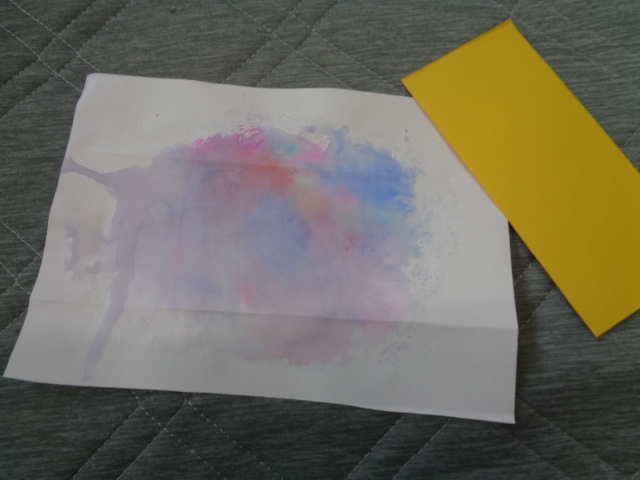 そしてもうひとつ、色水のにじみ絵でアサガオを作りました。紙にボトルをトントン。