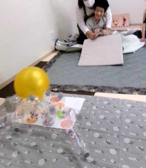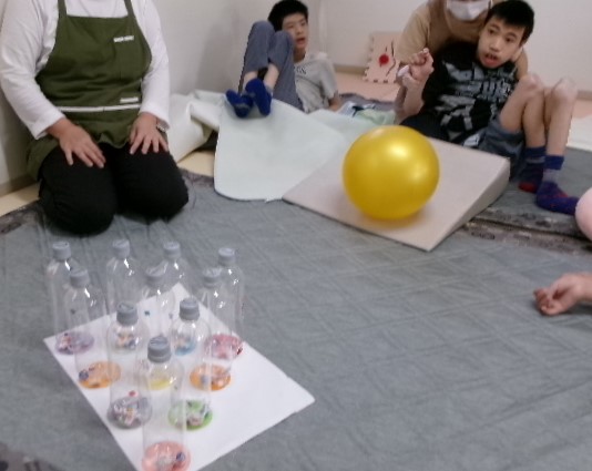 ペットボトルを転がしたり、振ったり…。