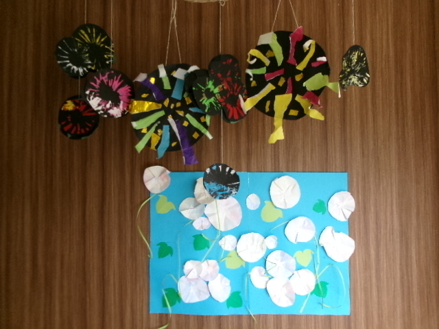 皆さんが切った色とりどりの折り紙は、迫力ある花火に変身します。