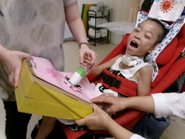 最近、サンキッズで密かなブームになっている遊びを紹介します。牛乳パックで作ったおもちゃです。
