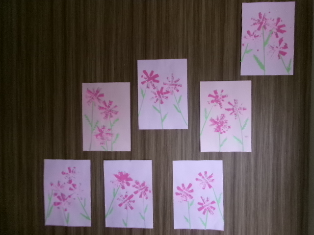 スタンプをペタンペタン。玄関には、コスモスの花が咲きました。