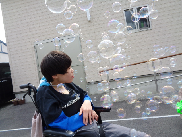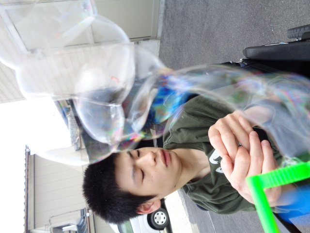 お天気が良かったので駐車場でシャボン玉をしました。