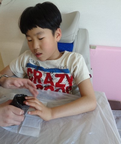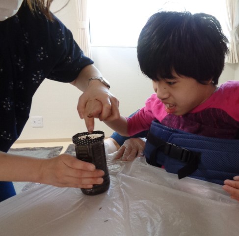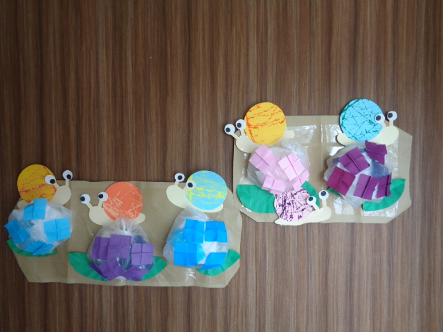 今月の制作活動は、ビー玉の転がし絵でカタツムリの殻の模様を作りました。