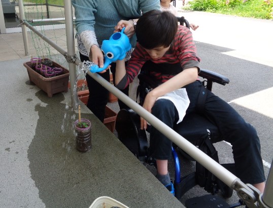 皆さんで順番に水やりを行い、プランターへ植え替えをしました。