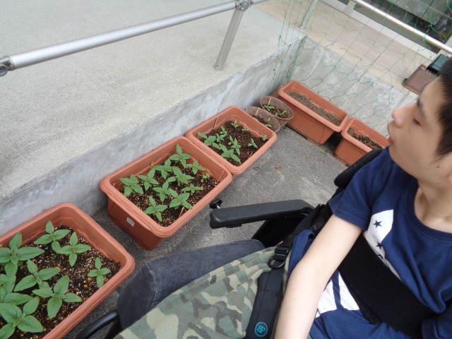 先月種をまいた≪ミニひまわり≫がすくすく成長し、葉っぱが大きくなってきました。