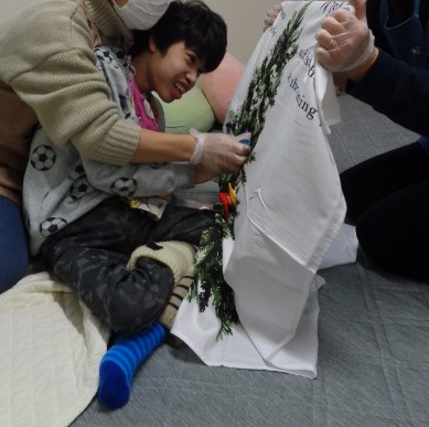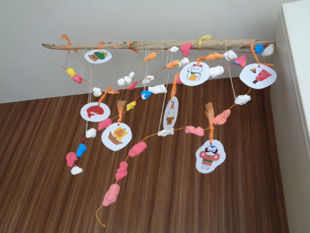 粘土を針金に付けて完成!新年のサンキッズ玄関が華やかになりました。