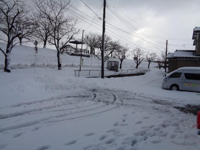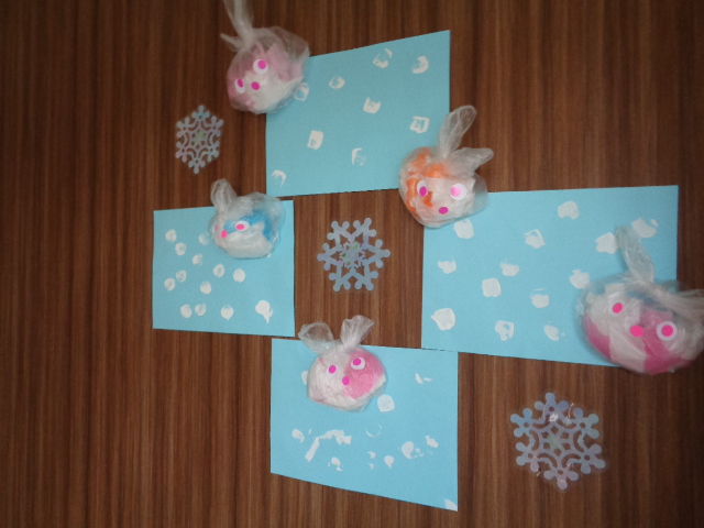 玄関には、みんなのうさぎと雪景色が飾られました。