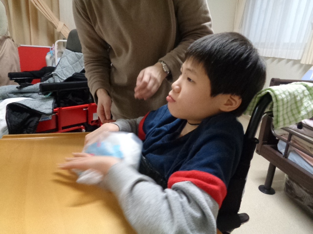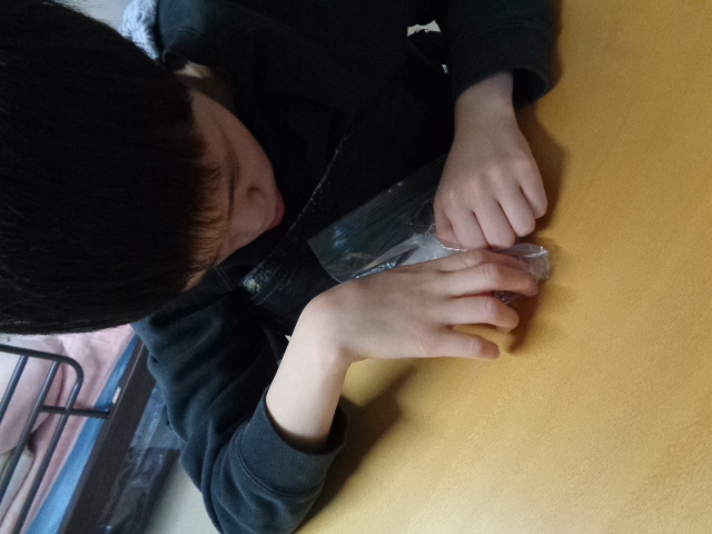 柔らかい紙粘土をこねこね。袋に入れて感触を確かめたり、手でぎゅっぎゅっと握りました。