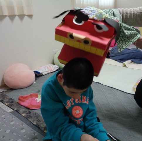 サンキッズに獅子舞登場。大きく目を開けてびっくりする方、そっ…と目をそらす方。皆さんの色々な表現が見られました。
