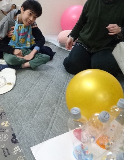 プチプチシートをスタンプにして、リズムに合わせ、ポンポンポン![]()