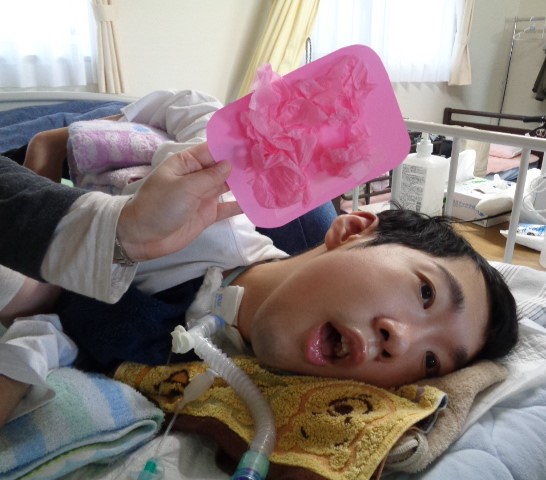 お花紙を触って、ちぎって。ビニール袋に詰めます。